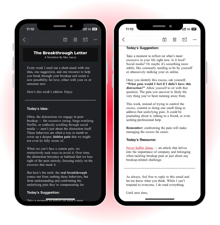We're talking about professionally-made courses, a private community to discuss breakups, weekly live coaching calls, direct access to me for personalized guidance, and more.